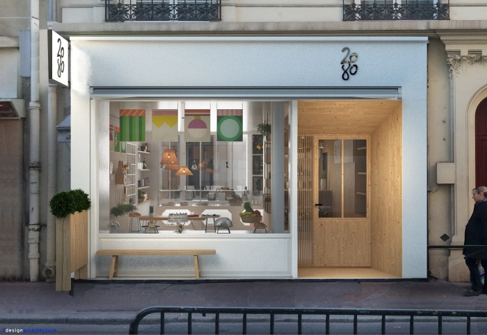 20% d'un matériaux, 80% de l'autre, ici bardage bois clair et Blanc satiné, ce concept simple et fort se déclinera en plusieurs corners de vente, boutiques, salons événementiels, CIE d'entreprises.