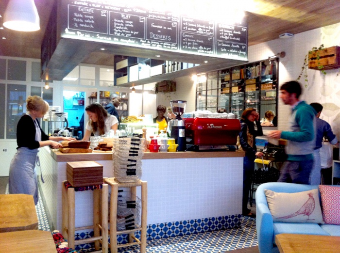 Le concept dégagé ici est simple: un comptoir central autour duquel le consommateur déambule tout en faisant ses choix d'entrée plats, desserts et boissons (maison)que le staff lui sert sur un beau plateau en bois. Le client a alors le choix de déguster sur place ou à emporter. Naturellement l'espace s'est alors divisé en 2 espaces principaux bien distincts: la partie comptoir, un peu reculée, plus proche des cuisines, carrelée de petits carreaux blancs et cernée de mange-debouts en chêne épais et bruts contre les murs d'enceinte, avec son comptoir dessiné sur mesure, surmonté d'un jeu d'étagères métalliques volontairement très fines et laissée brutes; puis une partie salon, dès l'entrée et derrière la vitrine, permet d'accueillir les clients à table, au repas et même toute la journée en version coffee shop, ou brunch.