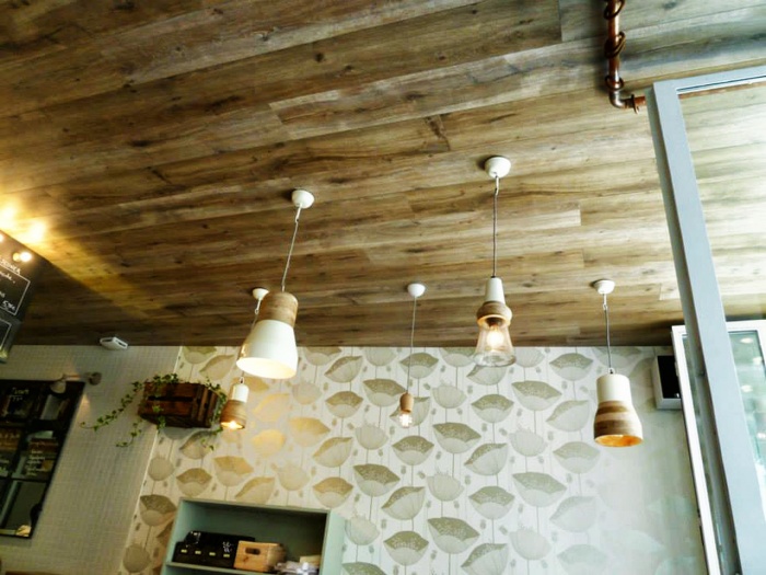 Au plafonds, le bois réchauffe l'atmosphère et participe au cocooning de l'ensemble...